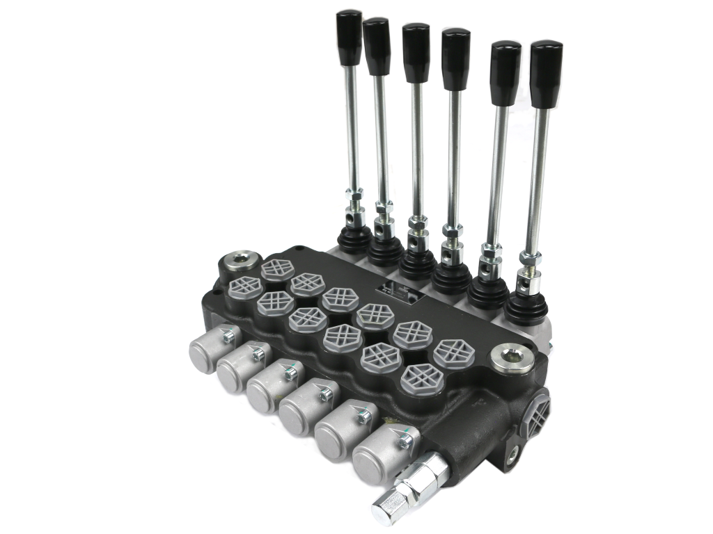 Rozdzielacz hydrauliczny 6-sekcyjny 80L VOIMA - monoblokowy z układem równoległym z neutralną pozycją środkową. Olej w pozycji neutralnej krąży między pompą hydrauliczną a zbiornikiem.