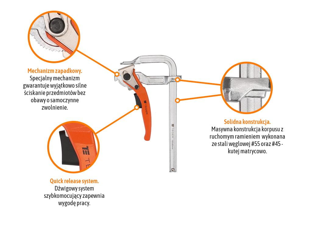 Zastosowanie: Narzędzia TEGER nadają się dla każdego majsterkowicza jak i profesjonalisty. Znajdą zastosowanie w przydomowym garażu gospodarstwie rolnym oraz na budowie. Ścisk to jedno z podstawowych narzędzi w warsztacie podczas prac ślusarskich stolarskich czy montażowych. Jego głównym zadaniem jest trzymanie w miejscu obrabianych elementów podczas klejenia wiercenia cięcia lub spawania. Dzięki temu narzędziu można zapewnić stabilność i precyzję w pracy.
