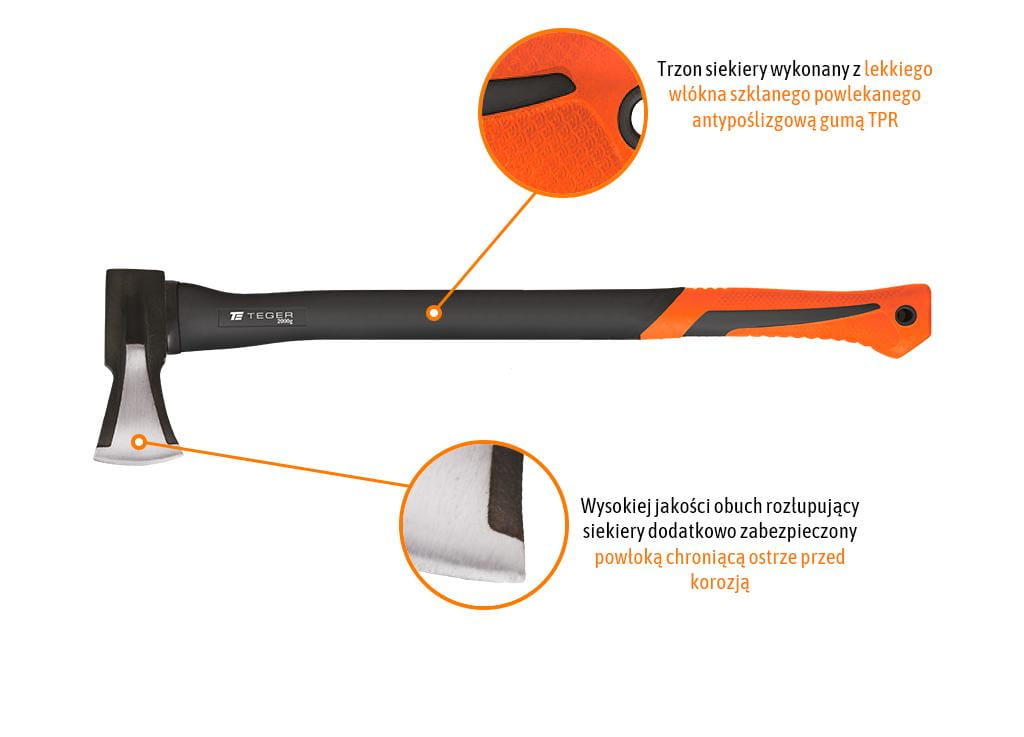 Siekiera rozłupująca z trzonkiem fiberglass marki TEGER przeznaczona do prac podczas rąbania drewna. Jej trzonek został wykonany z lekkiego i trwałego tworzywa FiberGlass, będącego kompozytem włókna szklanego, dzięki czemu siekiera jest nie tylko lekka , ale też wytrzymała, nie podlega działaniu warunków atmosferycznych, w tym wilgoci, co sprawia, że można z niej korzystać przez długie lata. Na komfort użytkowania wpływa również optymalny kształt ostrza oraz jego odpowiednie wyważenie które zapewnia jeszcze skuteczniejsze rozłupywanie drewna. W razie konieczności naostrzyć ostrze po pierwszym użyciu.
