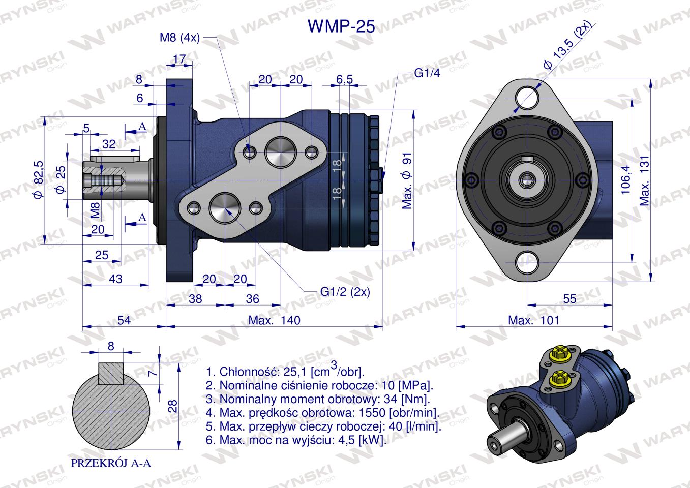 Silnik hydrauliczny orbitalny WMP 25 cm?/obr (100 bar / max.175 bar) Waryński