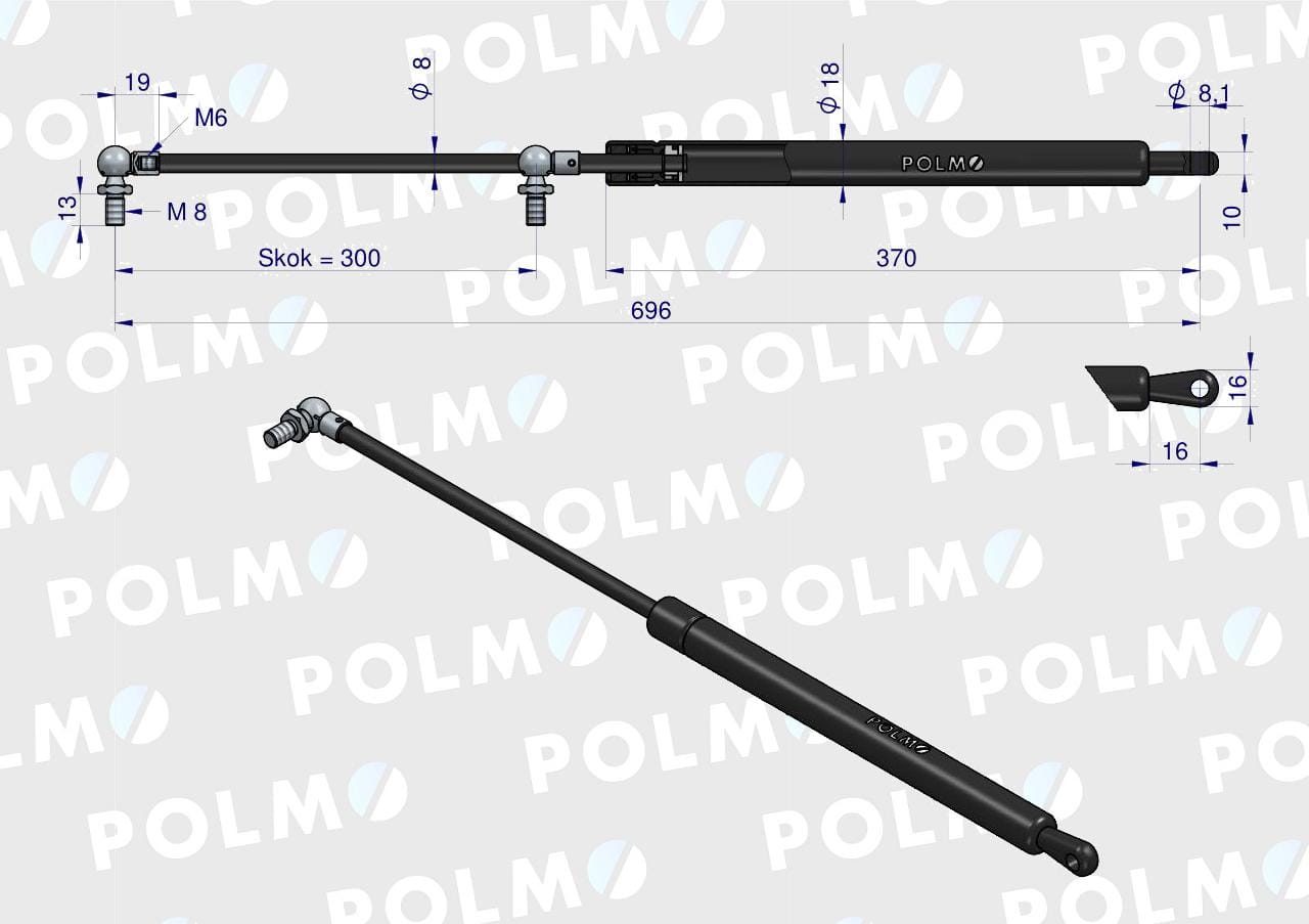 Siłownik szyby przedniej L max. 696mm 222114A0P CASE IH POLMO