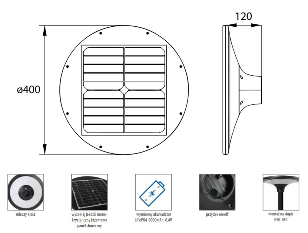 Sugerowana wysokość montażu oprawy: 2-4 m. Oprawa przystosowana jest do montażu na słupie pionowym fi 50-60mm (brak słupa w zestawie). Oprawa załącza się samoistnie po zmierzchu i działa tak długo, na ile pozwala naładowany w ciągu dnia akumulator. Naświetlacz zasilany jest energią słoneczną, należy go zainstalować w miejscu, w którym można uzyskać wystarczającą ilość światła słonecznego.