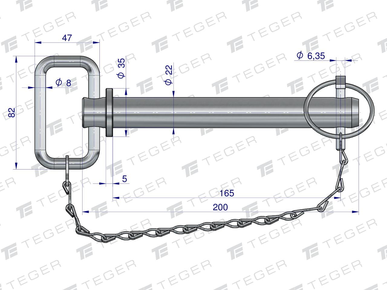 Sworzeń zaczepu z zawleczką i łańcuchem 22x165x200 TEGER
