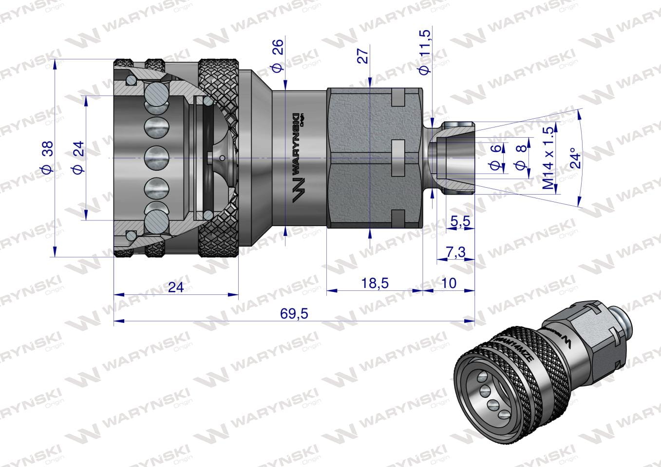 Szybkozłącze hydrauliczne gniazdo M14x1.5 gwint zewnętrzny EURO (ISO 7241-A) z eliminatorem ciśnienia Waryński