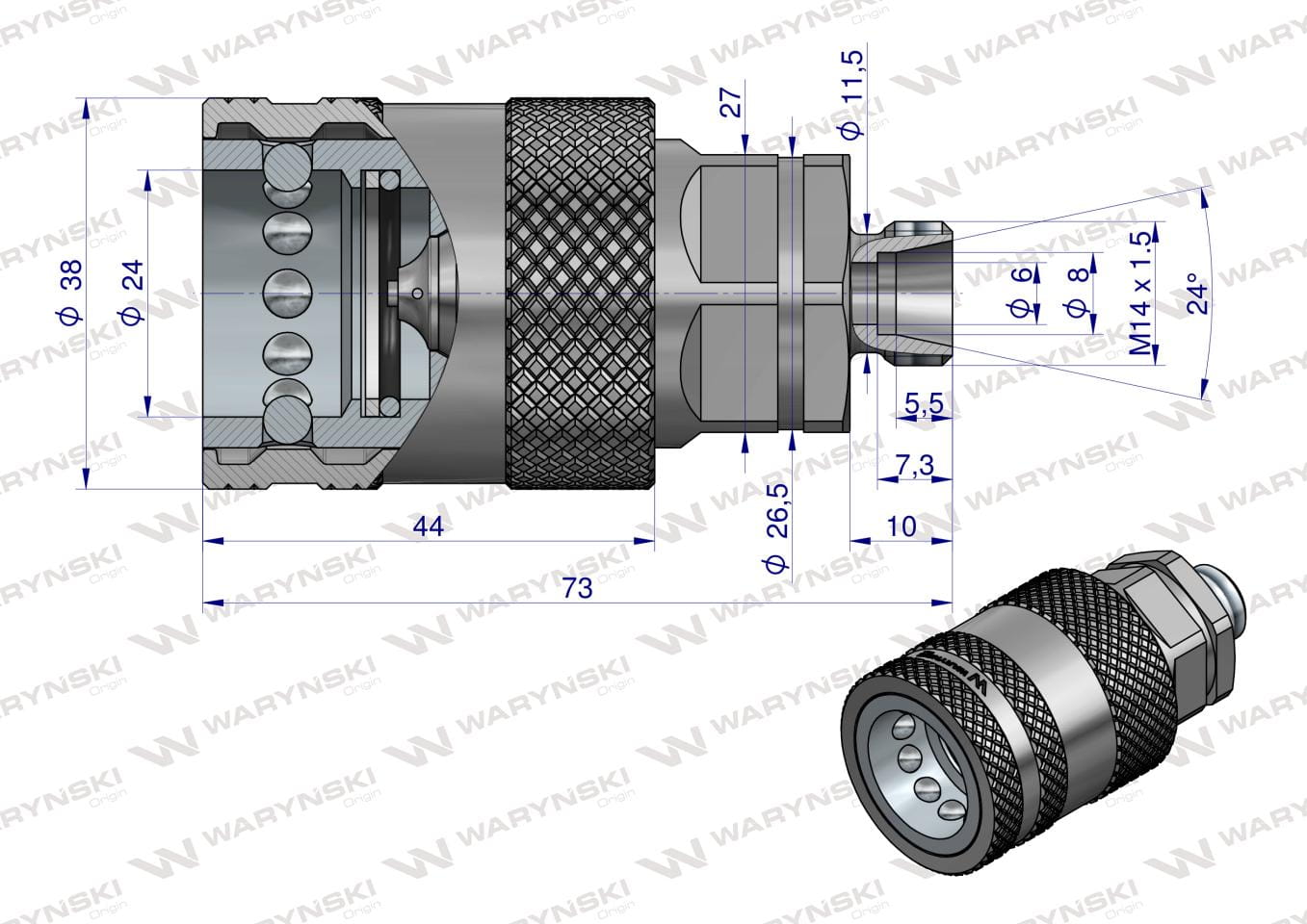 Szybkozłącze hydrauliczne gniazdo M14x1.5 gwint zewnętrzny EURO PUSH-PULL (ISO 7241-A) z eliminatorem ciśnienia Waryński