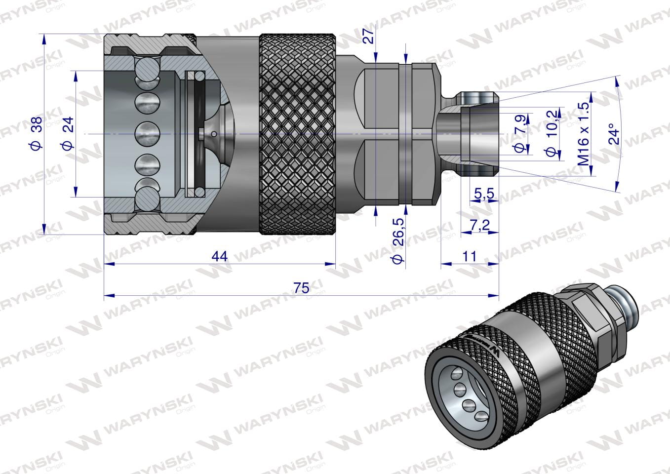 Szybkozłącze hydrauliczne gniazdo M16x1.5 gwint zewnętrzny EURO PUSH-PULL (ISO 7241-A) z eliminatorem ciśnienia Waryński