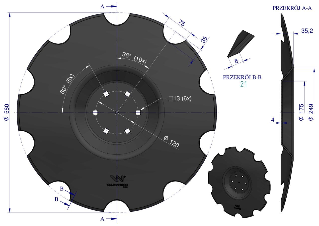 Talerz uzębiony Z-10 fi 560 mocowanie 6/120 grubość 4 mm przetłoczony stal borowa WARYŃSKI R