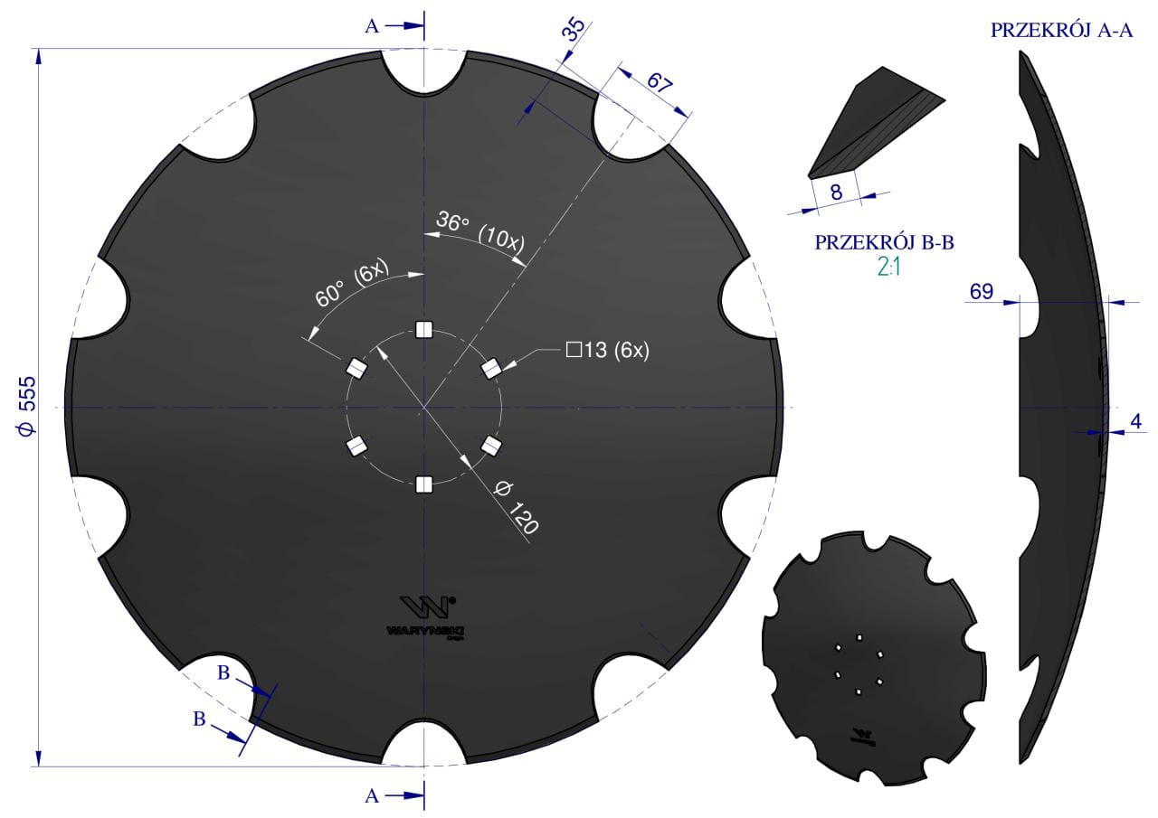 Talerz uzębiony Z-10 fi 560 mocowanie 6/120 grubość 4 mm stal borowa WARYŃSKI R