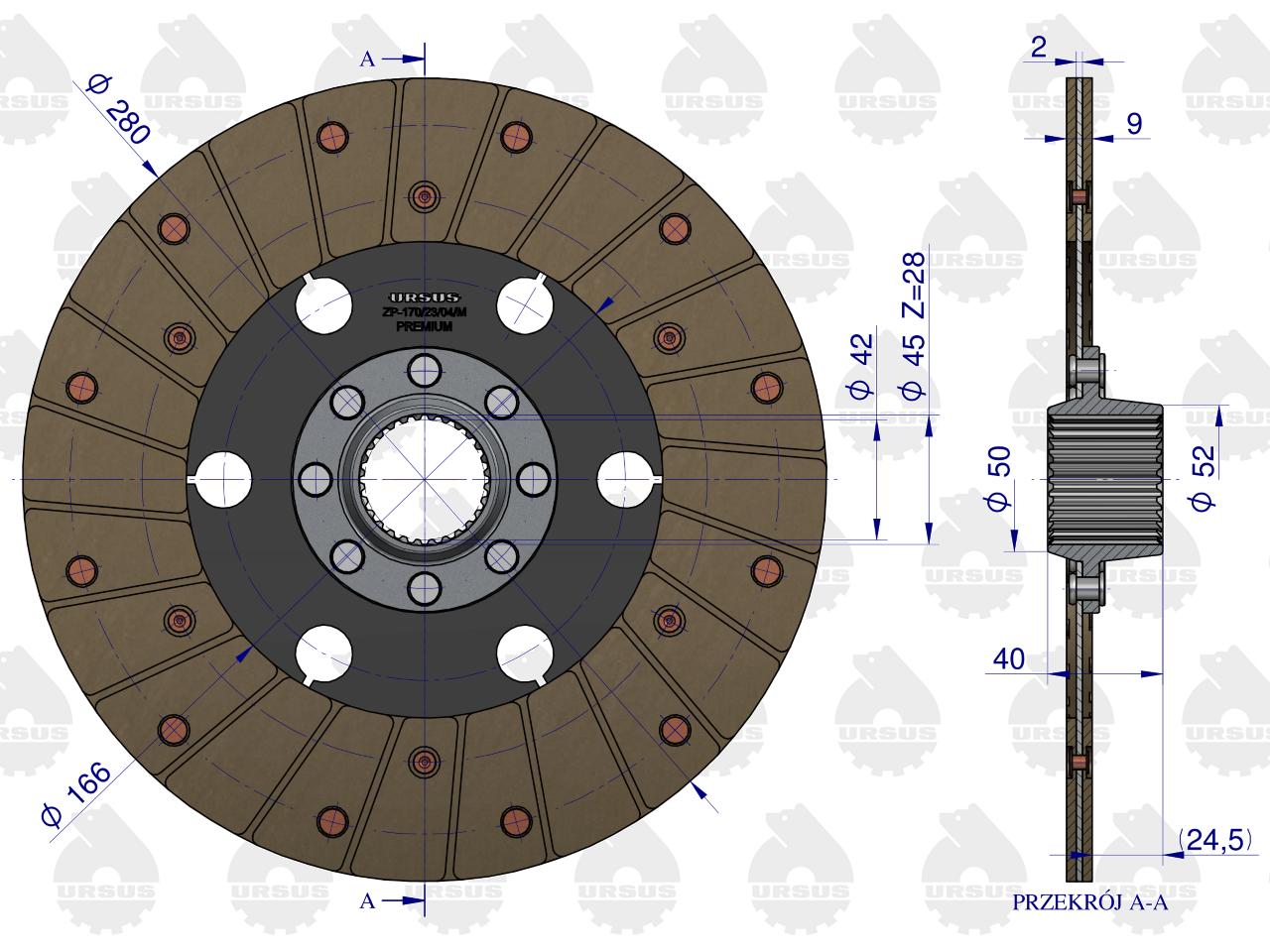 Tarcza sprzęgłowa w marce Ursus to produkt najwyższej jakości. Tarcza Sprzęgłowa jest jednym z najważniejszych elementów układu przeniesienia napędu. Odpowiada za przekazanie momentu obrotowego z koła zamachowego na wałek sprzęgłowy skrzyni biegów. Jednym z zadań tarczy sprzęgła jest również redukcja i tłumienie drgań przenoszonych obciążeń. Tarcza sprzęgłowa premium wyróżnia się dłuższą żywotnością zwiększoną o 30%, posiada zwiększoną liczbę nitów piasty, zostały również zmienione nity okładziny z aluminiowych na miedziane. Okładzina posiada więcej włókien, które wydłużają jej żywotność. Każdy produkt posiada 5 letnią żelazną gwarancję.