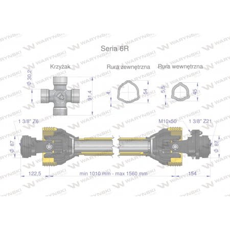 Wał przegubowo-teleskopowy 1010-1560mm 830Nm sprzęgło z kołkiem Z21 2500 Nm CE 2020 seria 6R Waryński
