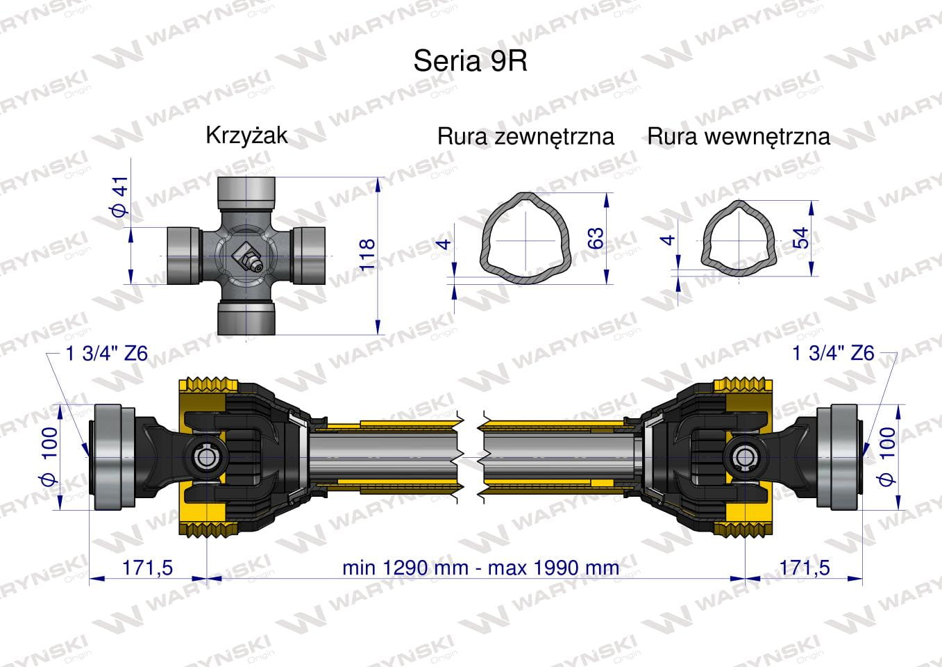 Wał przegubowo-teleskopowy 1290-1990mm 1890Nm Z6 - 1 3/4 z dwóch stron CE 2020 seria 9R Waryński