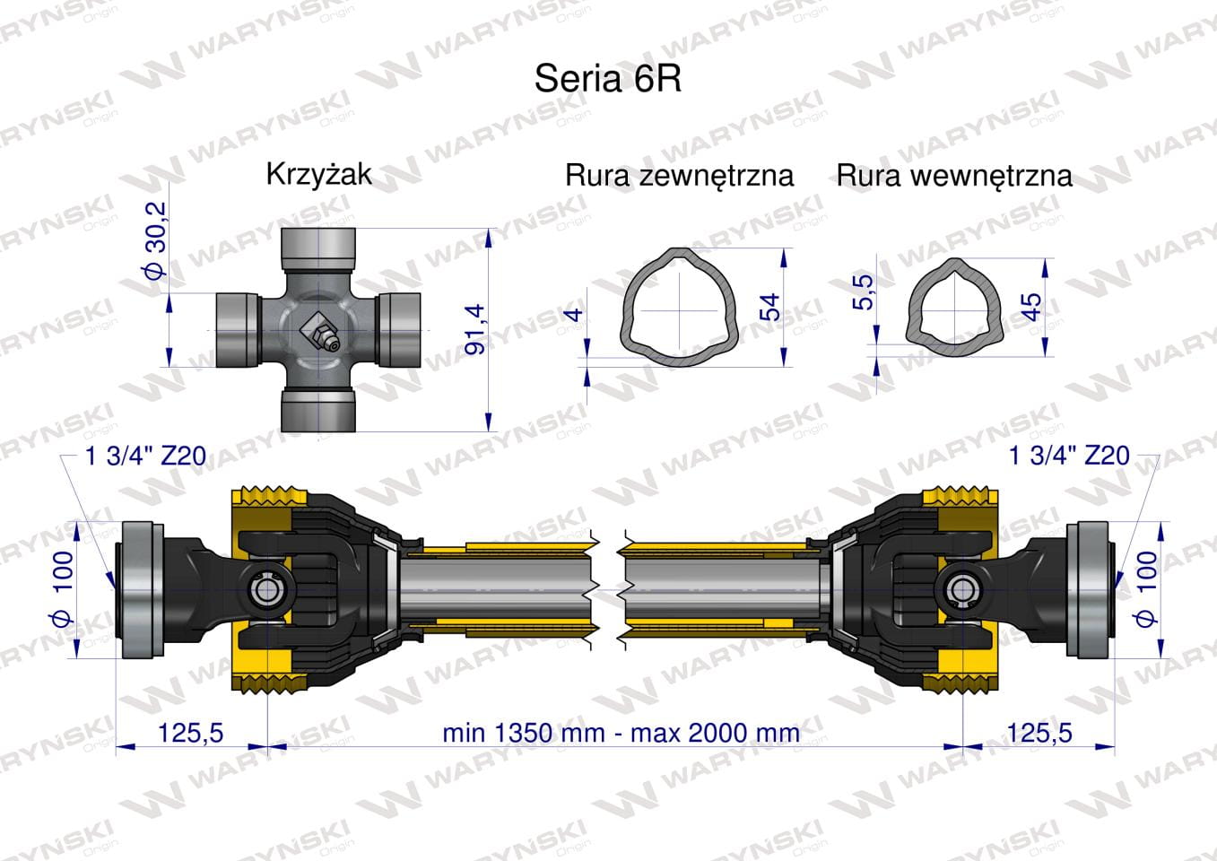 Wał przegubowo-teleskopowy 1350-2000mm 830Nm Z20 - 1 3/4 z dwóch stron CE 2020 seria 6R Waryński