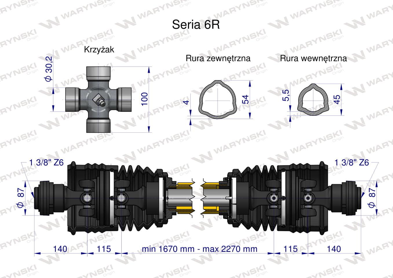 Wał przegubowo-teleskopowy 1670-2270mm 830Nm szerokokątny z dwóch stron CE 2020 seria 6R Waryński