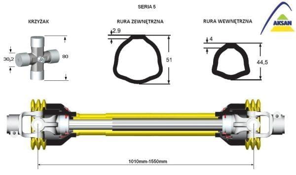 Wał przegubowo-teleskopowy (sprzęgło z kołkiem) 1010-1550mm 620 Nm 60970 CE seria 5 AKSAN