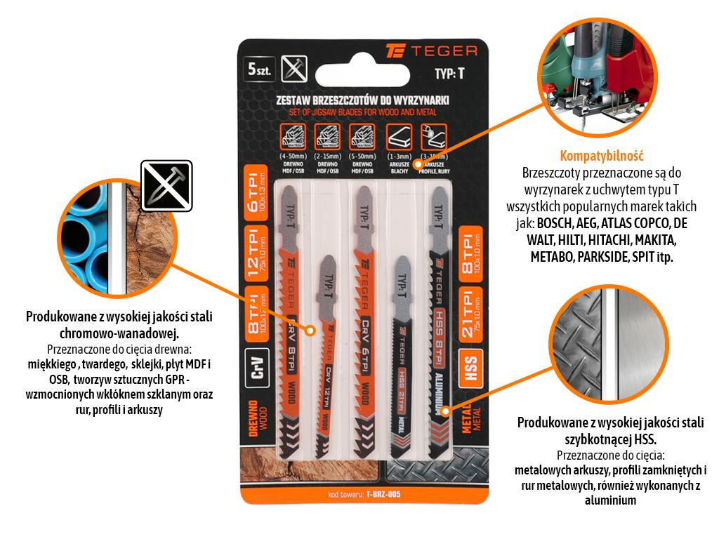 Zestaw brzeszczotów do wyrzynarki - Typ: T - METAL/DREWNO (5szt) TEGER