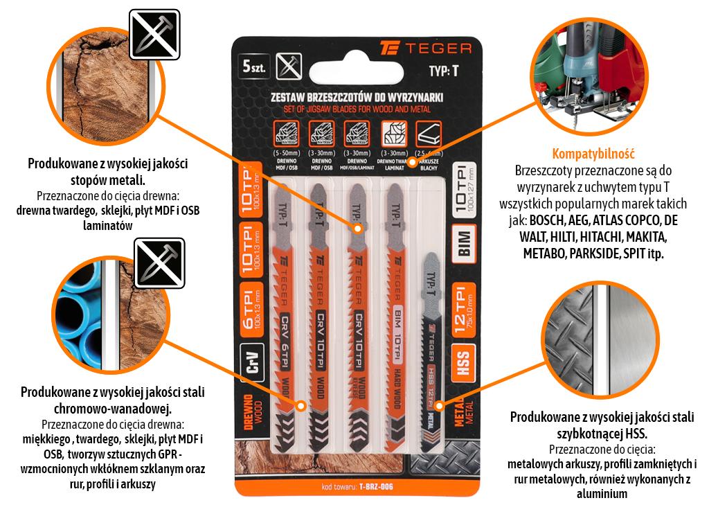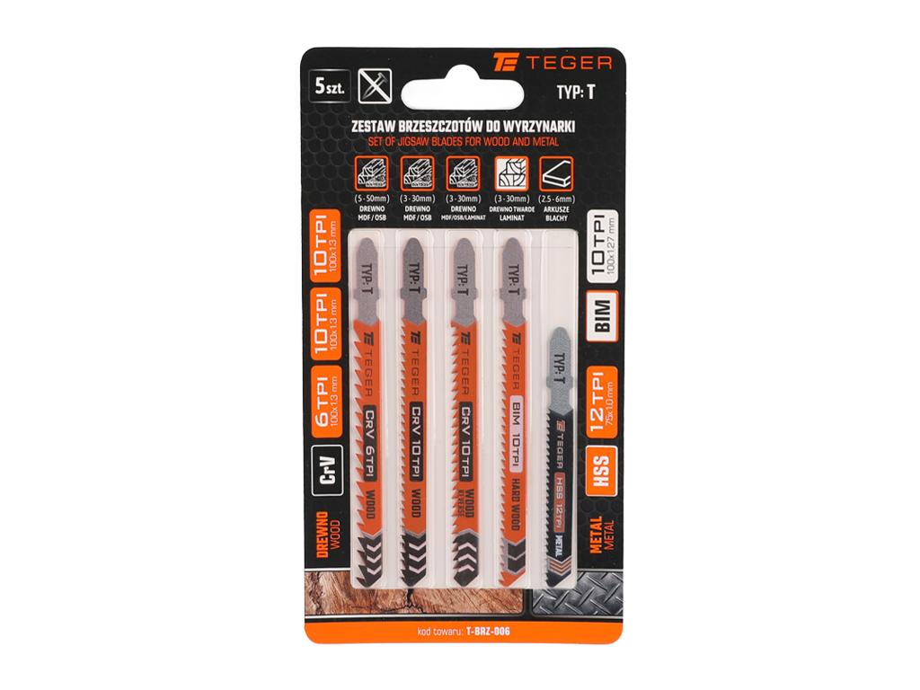 Zestaw brzeszczotów do wyrzynarki - Typ: T - METAL/DREWNO / TEGER to popularne narzędzie przeznaczone do wyrzynarek, idealne do szybkiego cięcia drewna oraz materiałów takich jak drewno twarde , sklejka, płyty MDF i OSB, laminaty (3-30mm), tworzywa sztuczne GPR - wzmocnione włóknem szklanym, rury, profile, arkusze metalowe, arkusze blachy (2.5-6mm), profile zamknięte i rury metalowe (<30mm), to idealne narzędzie dla każdego majsterkowicza i profesjonalisty.