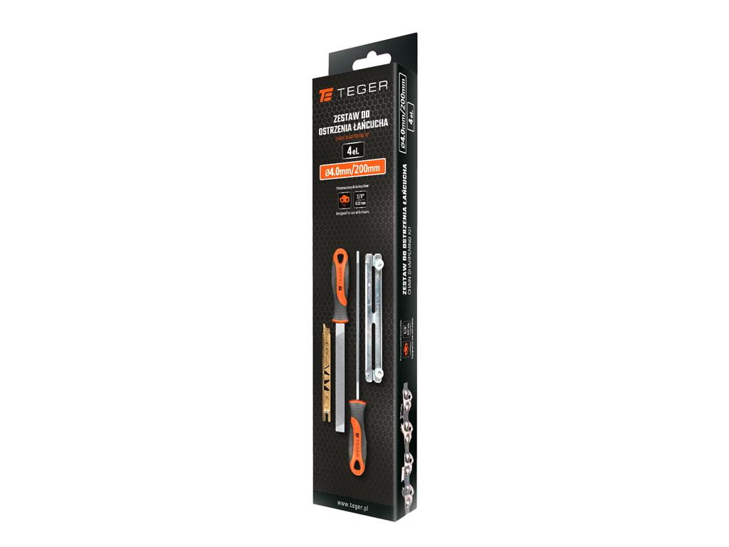 Zestaw do ostrzenia łańcucha 4.0/200mm - 3/8" (4 el), Teger to profesjonalny 4-elementowy zestaw do ostrzenia łańcuchów o skoku 3/8", to niezbędne narzędzie dla każdego użytkownika pilarek łańcuchowych.