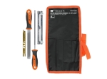Całość mieści się w praktycznym, zamykanym na suwak pokrowcu, co ułatwia przechowywanie i transport narzędzi.