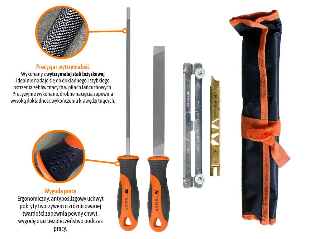 Zastosowanie: Narzędzia TEGER nadają się dla każdego majsterkowicza jak i profesjonalisty. Znajdą zastosowanie w przydomowym garażu gospodarstwie rolnym oraz na budowie. Dzięki swojej solidnej konstrukcji pilnik TEGER to idealny wybór dla profesjonalistów (leśnictwo stolarka budownictwo) jak i do codziennych prac domowych. Regularne ostrzenie łańcucha pozwala na płynniejsze cięcie drewna zmniejsza zużycie paliwa oraz zapobiega nadmiernemu obciążeniu silnika.