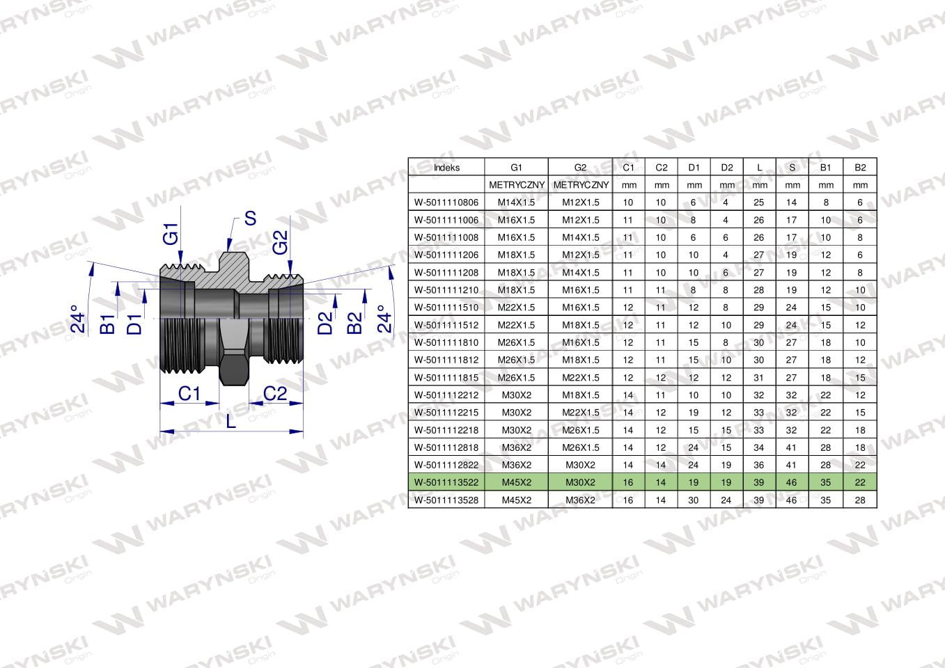 Złączka hydrauliczna redukcyjna metryczna BB M45x2 35L / M30x2 22L (XG) Waryński